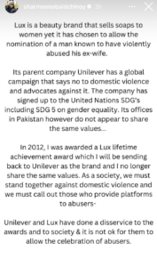 Sharmeen Obaid, The Saving Face director stated on her Instagram Stories, “Lux is a beauty company that sells soap to women, yet it has decided to allow the candidacy of a man known to have severely beaten his ex-wife.” Unilever, the corporation that owns it, has a global campaign that says no to domestic abuse and campaigns against it. “The corporation signed up to the UN’s SDGs, including SDG 5 on gender equality,” she said, noting that Unilever’s Pakistan headquarters do not appear to share the same ideals.”