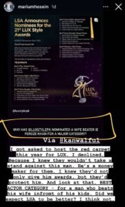 Many people remarked on the nominees revealed in a post shared across all LSA social media accounts. “Lux, do the right thing and quit praising abusers,” activist Usama Khilji commented. “Stand with abuse survivors.” “Stop supporting abusers and harassers and have some shame for God’s sake,” said influencer Naiha J. Eiman. “Expected better from you this time, but very disappointed and disgusted,” she continued.