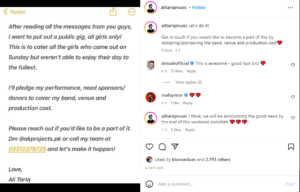 The singer received a lot of love in the comments area. RJ Dino Ali wished Tariq luck with his endeavour, while Eat Ahmed Godil, a host from Karachi, volunteered his hosting abilities for the all-women gig. Rafay Israr, a vocalist, expressed gratitude to the singer for his gesture.