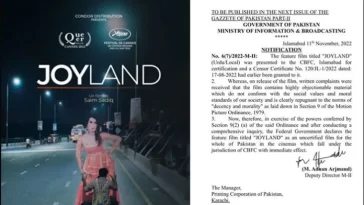 According to the letter delivered to Sarmad Sultan Khoosat by the Punjab Information and Culture Department on November 17, the “Joyland” team is not permitted to screen their movie within the boundaries of Punjab province until further notice by the Punjabi government.